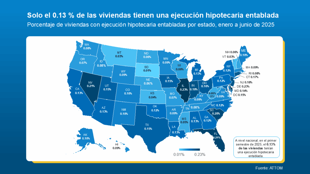 Para contextualizar, los datos de ATTOM muestran que, en la primera mitad de 2025, 1 de cada 758 viviendas en todo el país tenía una ejecución hipotecaria entablada. Ese es el 0.13 % que puede ver en el mapa de arriba. ¿Pero y en 2010, durante el desplome? Mortgage News Daily dice que era 1 de cada 45 casas.