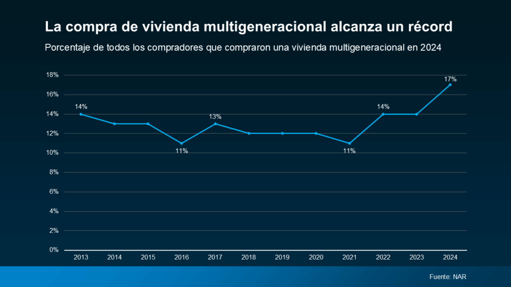 La vida multigeneracional va en aumento. Según la Asociación Nacional de Realtors (NAR por sus siglas en inglés), el 17 % de los compradores de vivienda compran una casa para compartirla con padres, hijos adultos o familiares. Esa es la proporción más alta jamás registrada por NAR (vea la gráfica a continuación):