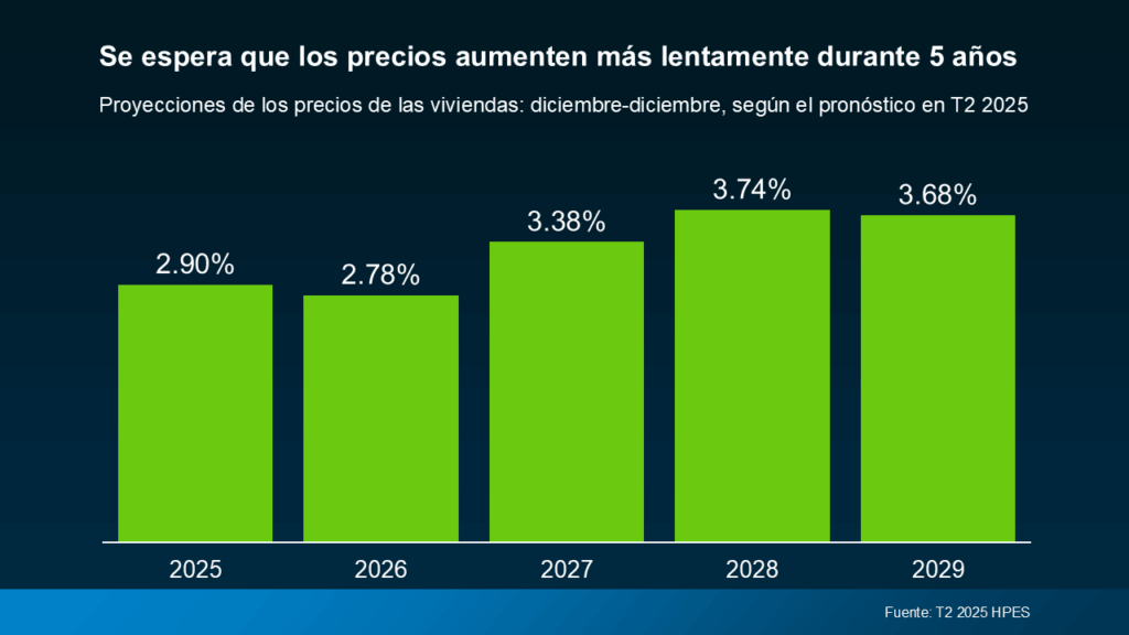 Más de 100 expertos líderes en el mercado de la vivienda fueron encuestados en la última Encuesta de las expectativas de los precios de las casas (HPES por sus siglas en inglés) de Fannie Mae. Su pronóstico colectivo muestra que se prevé que los precios sigan aumentando durante los próximos 5 años, solo que a un ritmo más lento y saludable que el que hemos visto más recientemente. Y ese tipo de aumento sostenido y constante debería ser un factor que ayude a aliviar sus temores sobre los años venideros (consulte la gráfica a continuación):