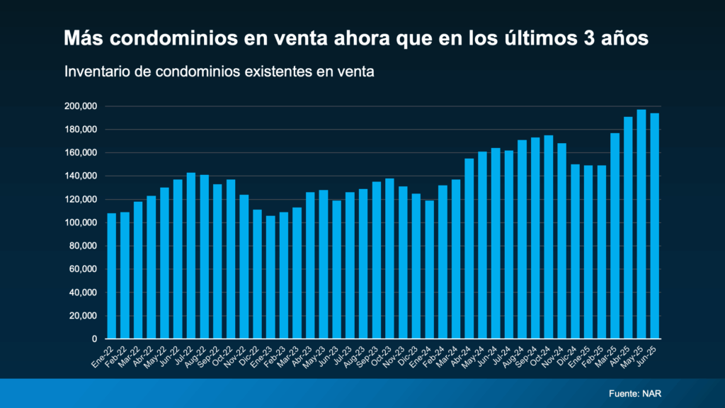 Según la Asociación Nacional de Realtors (NAR por sus siglas en inglés), hay 194,000 condominios a la venta en este momento. Esa es la segunda cantidad más alta que hemos visto en los últimos tres años (vea la gráfica a continuación):
