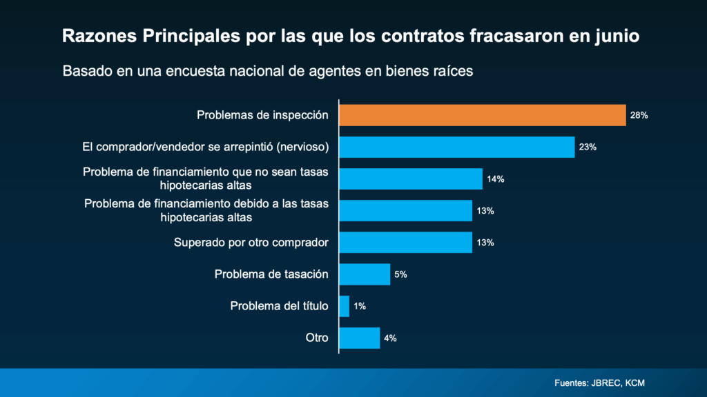 La clave para evitar este dolor de cabeza es saber qué está causando los problemas que llevan a un comprador a alejarse. Una encuesta reciente de agentes de John Burns Research and Consulting (JBREC) y Keeping Current Matters (KCM) encontró que la razón #1 por la que los contratos se están desmoronando hoy en día se deriva de la inspección de la casa (vea la gráfica a continuación):