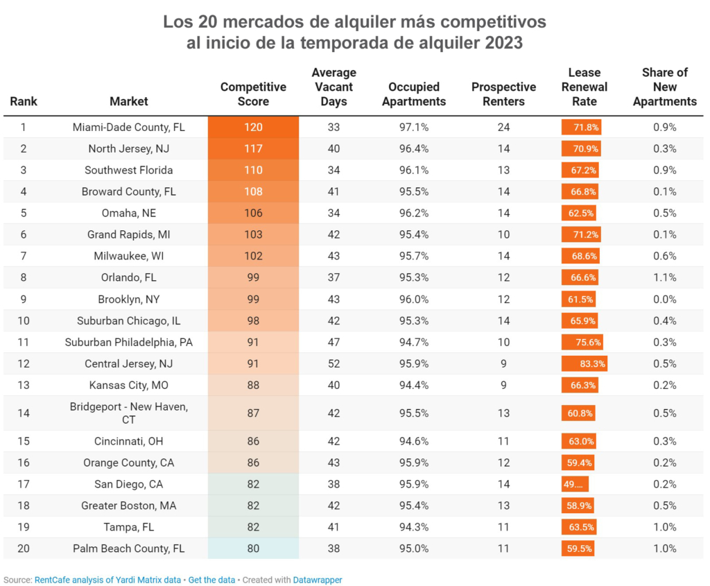 Un total de 24 posibles inquilinos compiten por cada alquiler disponible en Miami (el triple del promedio nacional), según el informe, y las unidades disponibles se alquilan en solo 33 días (10 días más rápido que el promedio nacional).