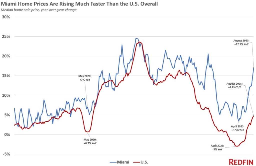 El corredor inmobiliario nacional Redfin informa que el precio medio de venta de una vivienda en Miami aumentó un 17% respecto al año anterior durante las cuatro semanas que terminaron el 27 de agosto de 2023, el mayor aumento que ha experimentado el área metropolitana desde octubre de 2022.