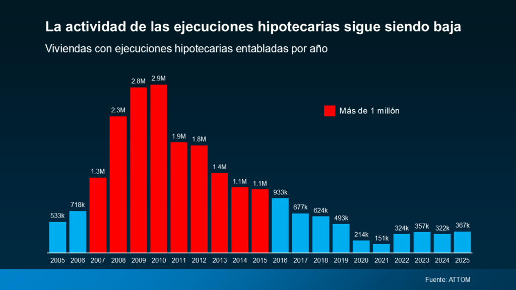 “La actividad de las ejecuciones hipotecarias aumentó en el 2025, reflejando una normalización continua del mercado de la vivienda tras varios años de niveles históricamente bajos… Aunque las ejecuciones hipotecarias entabladas, iniciadas y los embargos aumentaron en comparación con el 2024, la actividad de las ejecuciones hipotecarias sigue muy por debajo de las normas previas a la pandemia y es una fracción de lo que vimos durante la última crisis de la vivienda… El repunte de hoy está impulsado más por la recalibración del mercado que por la preocupación generalizada de los propietarios, con posiciones sólidas en plusvalía y un préstamo más disciplinado que continúan limitando el riesgo”.