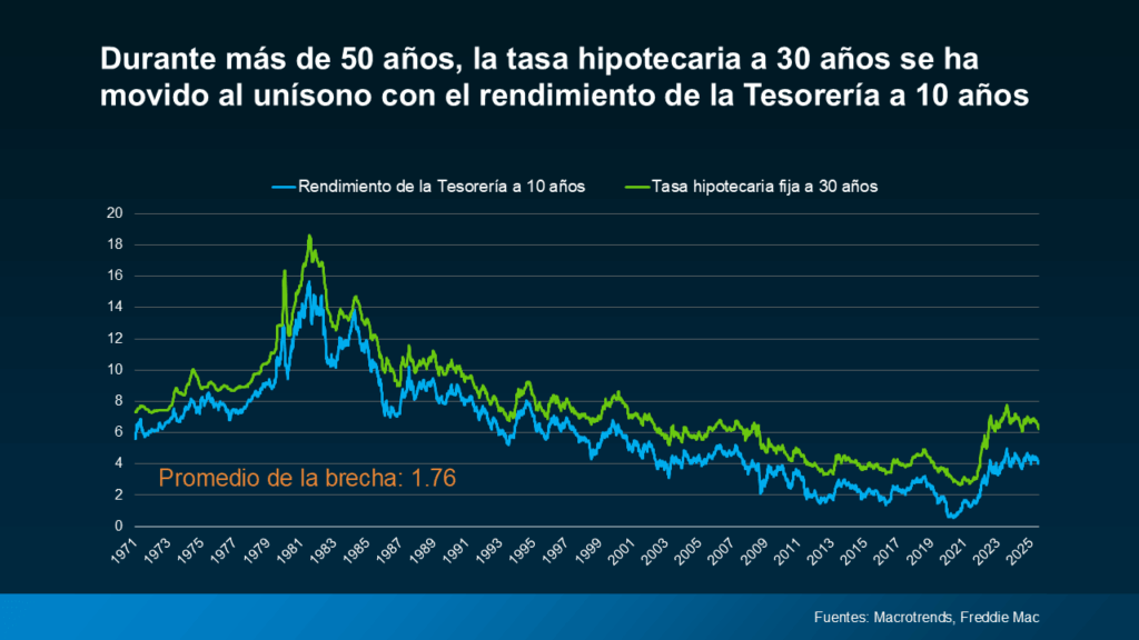 Durante más de 50 años, la tasa hipotecaria fija a 30 años ha seguido de cerca el movimiento del rendimiento de la Tesorería a 10 años, que es un punto de referencia ampliamente observado para las tasas de interés a largo plazo (vea la gráfica a continuación):