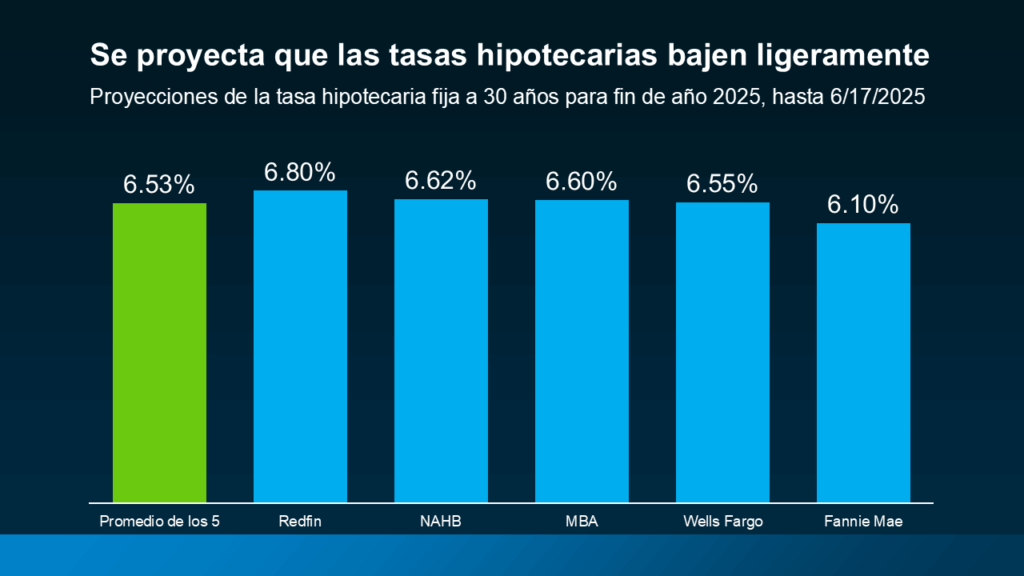 Sí, los expertos esperan que las tasas hipotecarias disminuyan, pero lentamente. Las últimas proyecciones muestran solo descensos modestos este año, no el 3 % que usted tal vez espera (vea la gráfica a continuación):