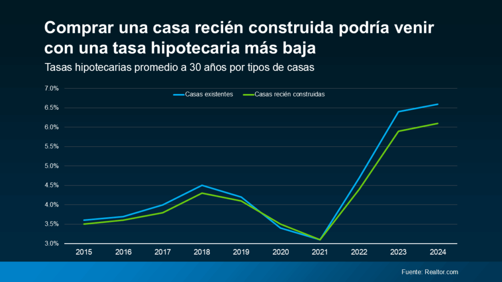 Los datos de Realtor.com muestran que, en el 2023 y 2024, los compradores de casas recién construidas obtuvieron una tasa hipotecaria alrededor de medio punto porcentual más baja en comparación con los que compraron casas ya existentes (vea la gráfica a continuación):